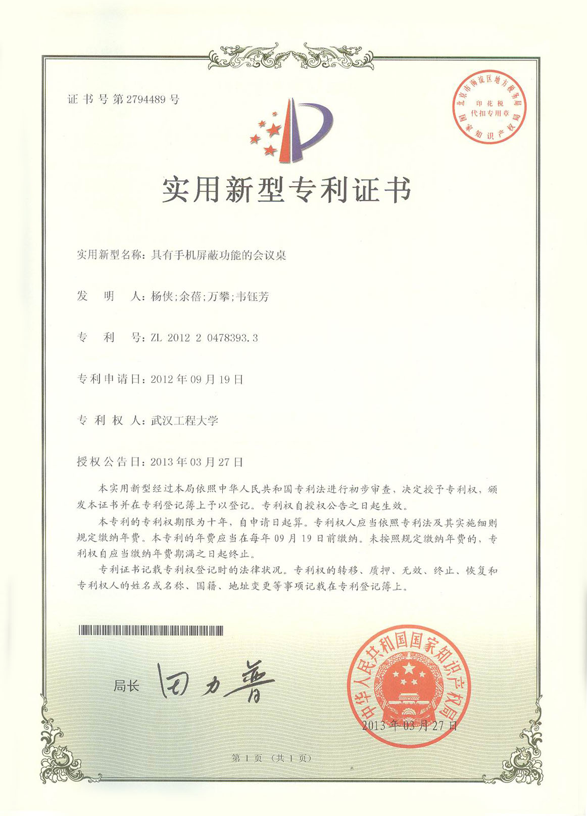 《具有手机屏蔽功能的会议桌》专利证书