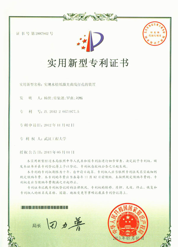 《实现水松纸激光红孔的装置》专利证书