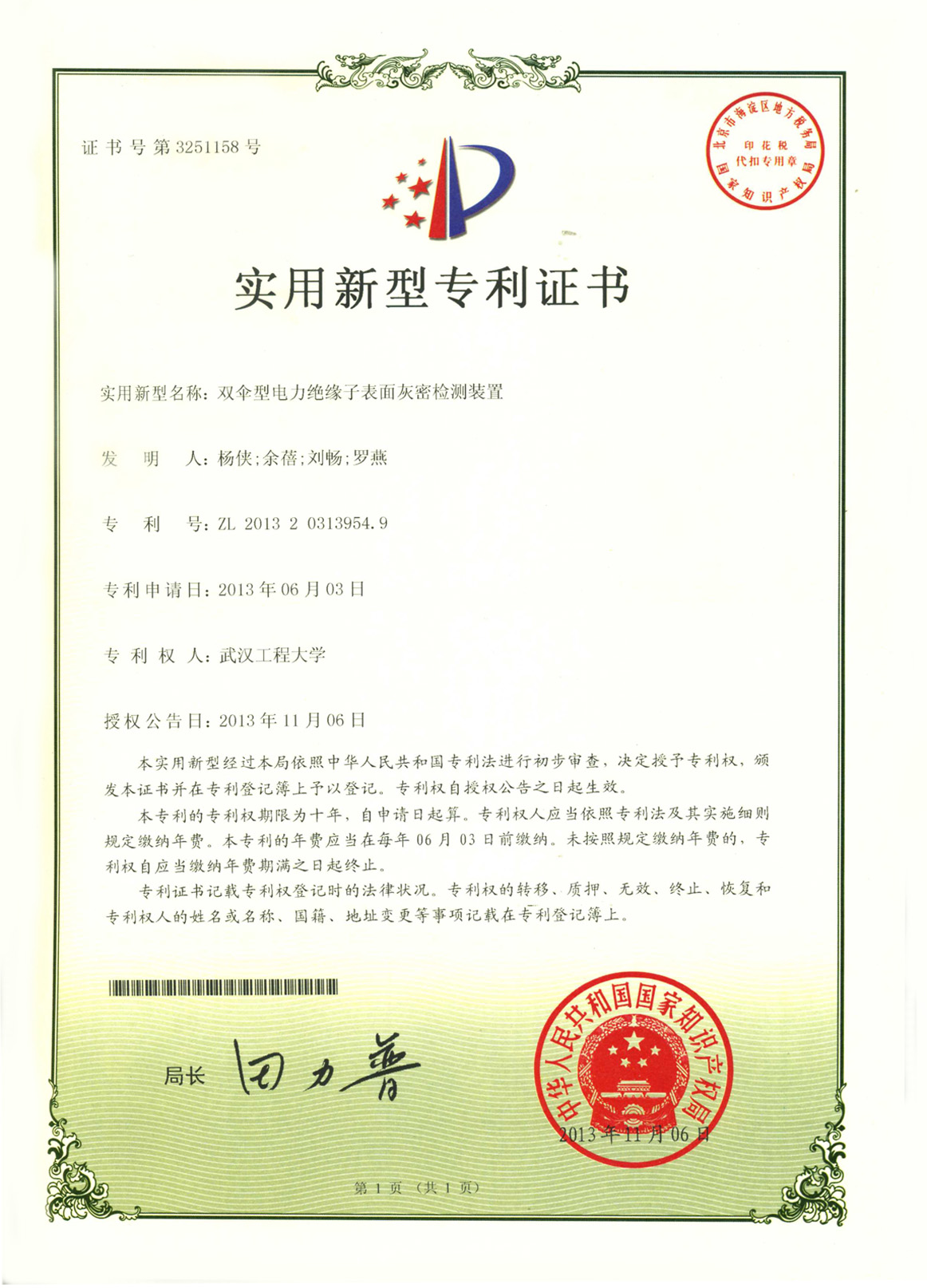 《双伞型电力绝缘子表面灰密检测装置》专利证书